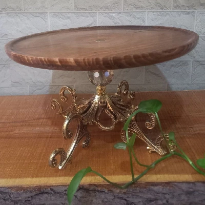 شیرینیخوری زیبا و مقاوم، ساختهشده از چوب گردوی طبیعی با پایه طلایی براق. قطر 30 سانتیمتری و طراحی لوکس آن، گزینهای ایدهآل برای پذیرایی و جلوهبخشی به میز شماست